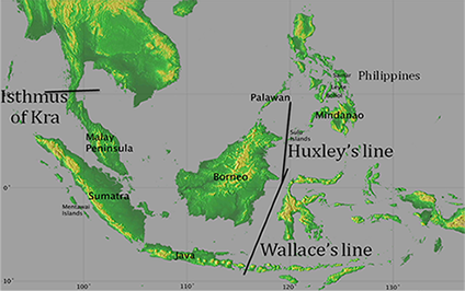 | Sundaland is the biogeographic region in southeast Asia which includes peninsular Malaysia and numerous nearby islands including Borneo, Sumatra and Java, but not Sulawesi or the Philippines. This region has been connected by dry land during much of the last few million years at times when the sea level was lower. This region is also very active tectonically and has many volcanoes and high mountains of a variety of heights including mountains over 2000 meters on all of the major land masses (Malay Peninsula, Sumatra and Borneo). This region is covered in tropical forest and is considered a hotspot because of its immense biodiversity. This diversity inspired A.R. Wallace with one of the greatest basic insights in the field of evolutionary biology that led him to propose the concept of speciation via natural selection around the same time that the Neotropics inspired C. Darwin to come up with very similar ideas. We also study this biodiversity in order to better understand evolution. |